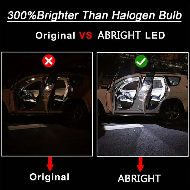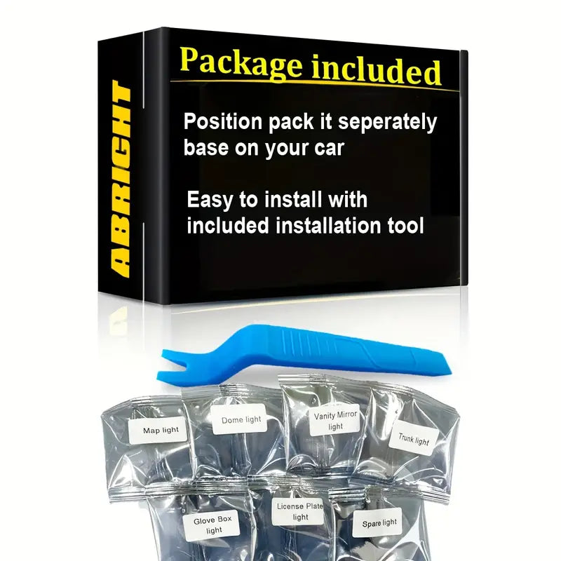 300% brighter than your original halogen bulbs. All LED lights are built in Constant Current IC ensures a lifespan of up to 40,000 hours. All LED Lights are CANBUS ready, error free - plug and play, no other parts or modifications required. Easy to install with included installation tool and placement guide. Upgrade your interior lights with the premium ABRIGHT interior lighting package. Your eyes will thank you! You'll love your car's customized feel