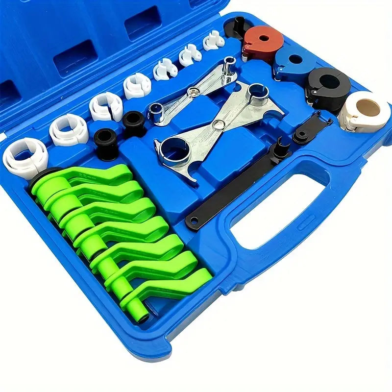 This product is a set of 25 pieces, a quick connector disassembly tool for automotive oil pipes/air conditioning cold air pipes, suitable for most fuel pipes, air conditioning pipes, radiator and heater hoses.