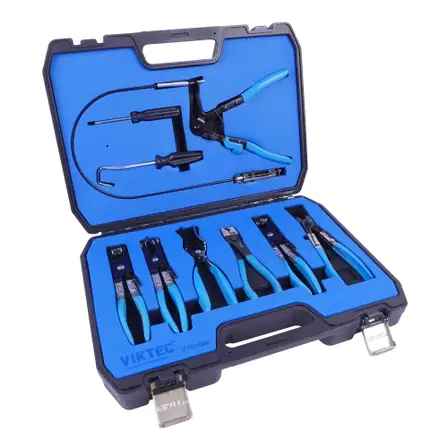 This Viktec kit not only contains a traditional hose clamp plier, but also; two swivel jaw hose clamp pliers; an angled flat bank hose clamp plier; a flat bank hose clamp plier; clic-r collar pliers; hose remover pliers; a screwdriver; and a hose remover.