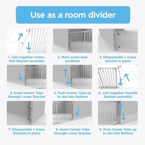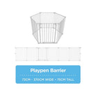 This Baby Playpen Barrier measures 75cm tall, 73cm – 370cm wide and makes a 16 square foot play area. 6 panels and wall mounting components included to convert playpen to a room divider or barrier. Made for use as a playpen, baby gate or safety barrier, this 3 in 1 solution it is suitable for children 6 – 24 months and small pets.
