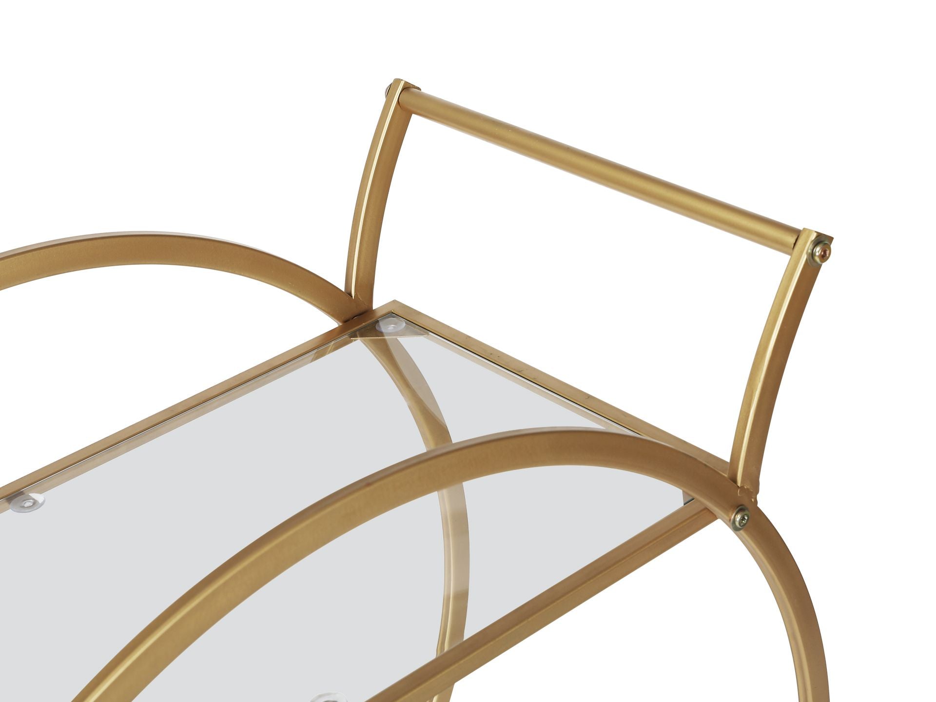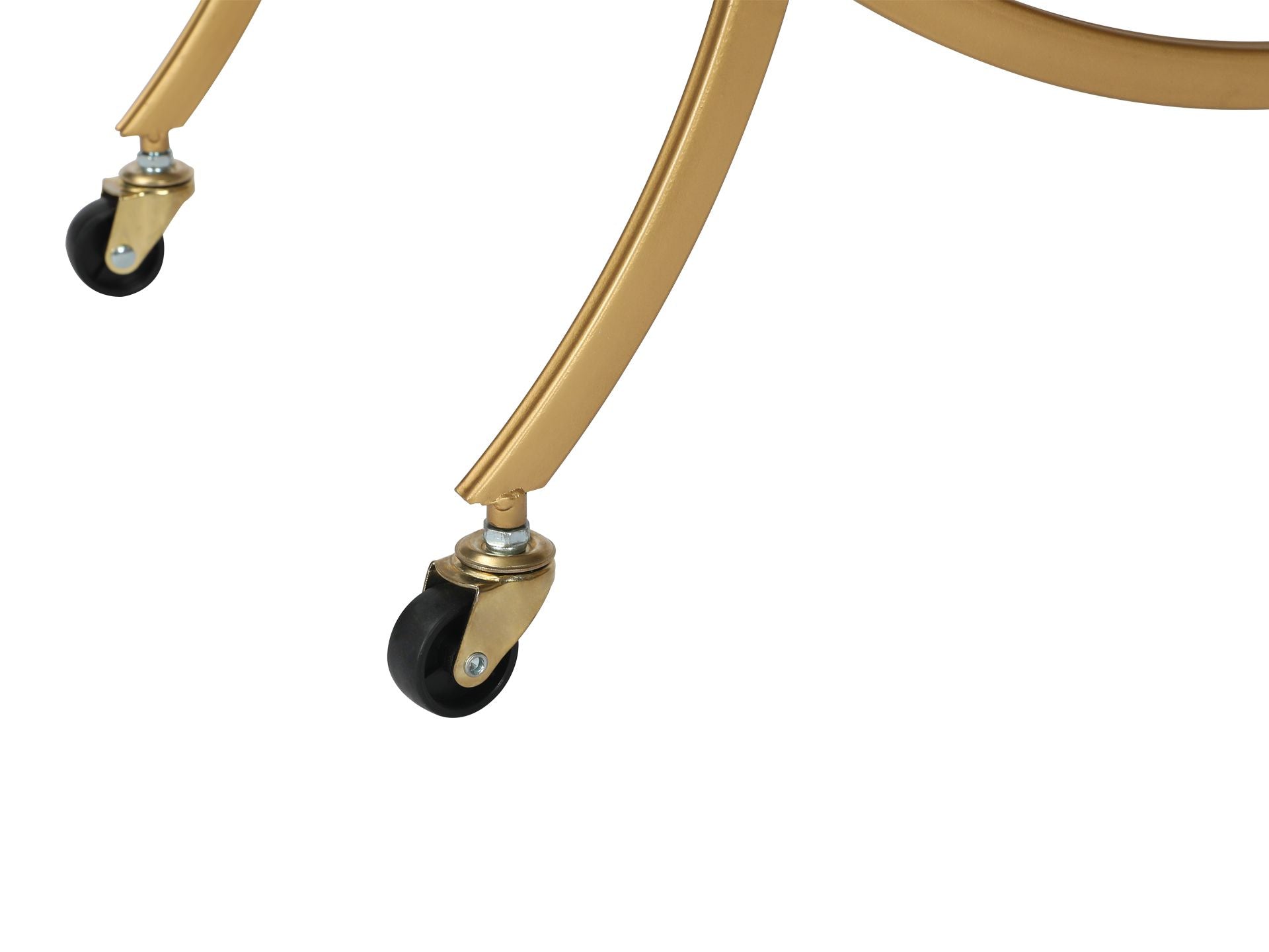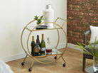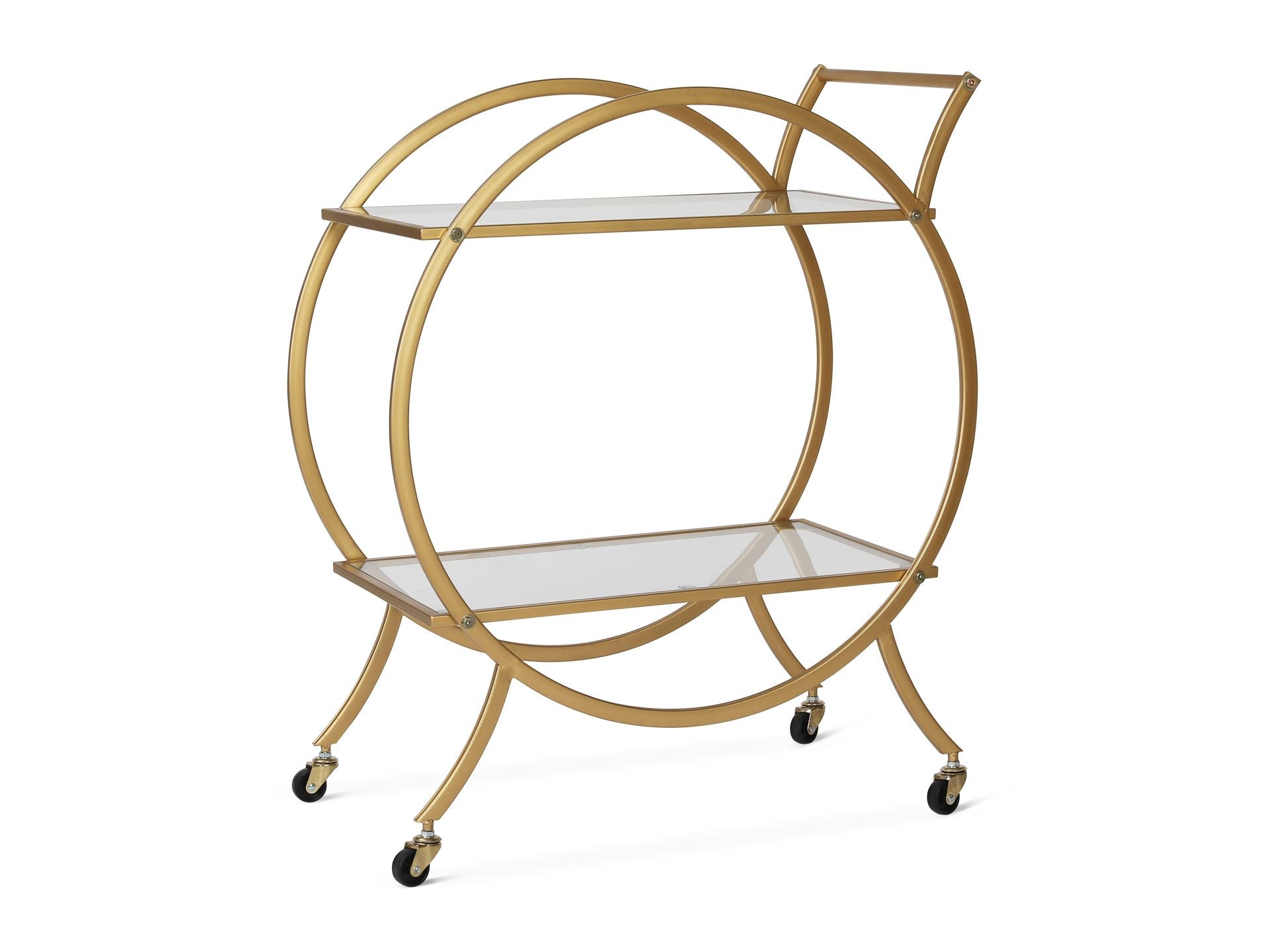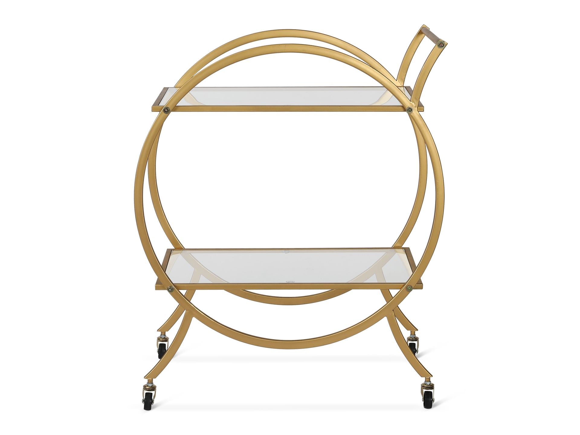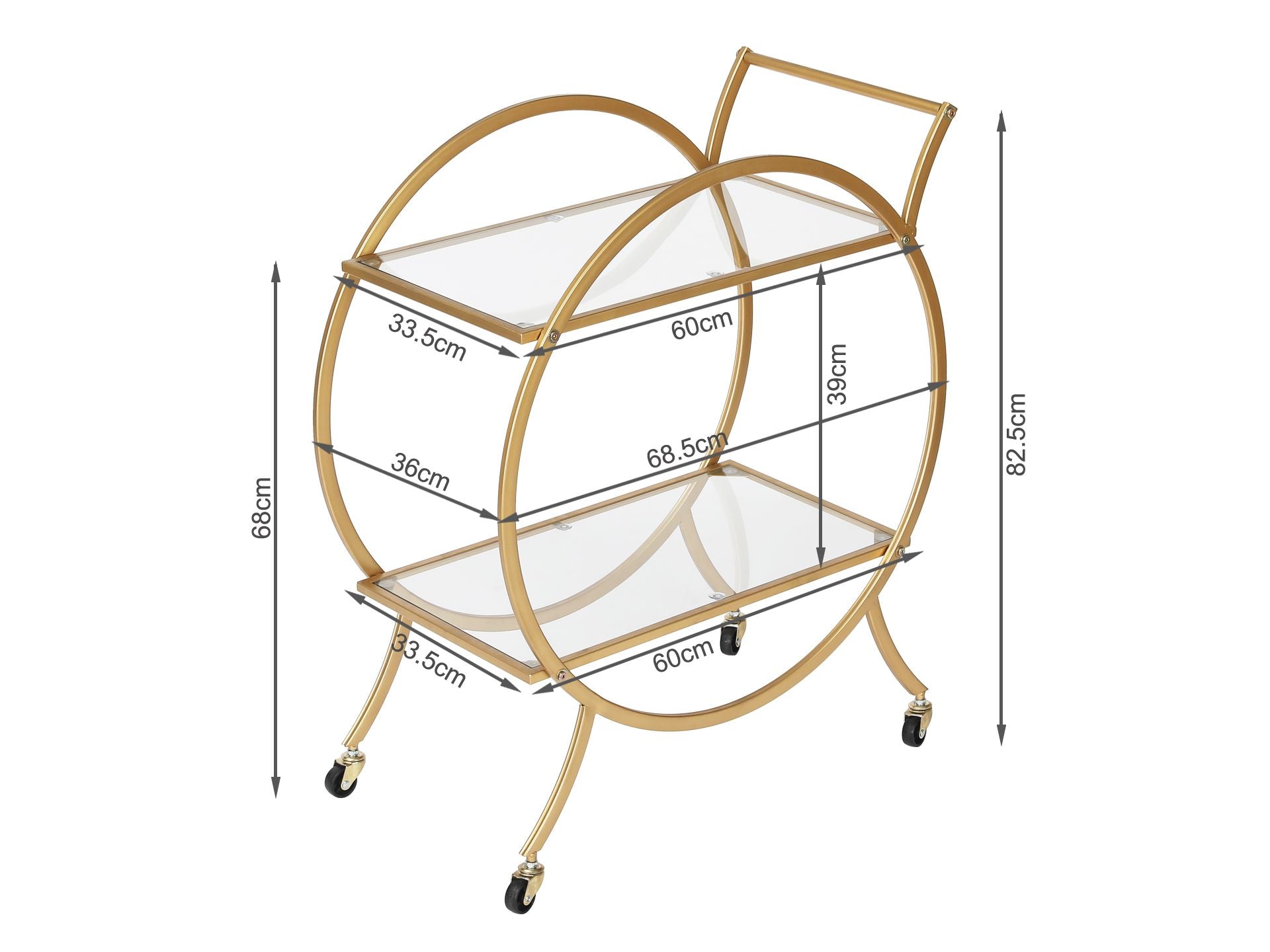 Revel in the fusion of style and practicality with our Ciar Metal Bar Cart. Made with a sturdy metal frame and tempered glass shelves, this cart exudes a retro allure that's bound to steal the spotlight at your gatherings. Its circular design not only adds a charming aesthetic, but also caters ample storage for your precious glassware, bottles, and accessories. Moving around your party is a breeze thanks to the integrated handle and four smooth-rolling wheels. Beyond just a party gem, this versatile piece is a functional star in any setting, allowing it to mirror your unique style and personality! Embrace this multifaceted piece, and let it reflect your personality and style!