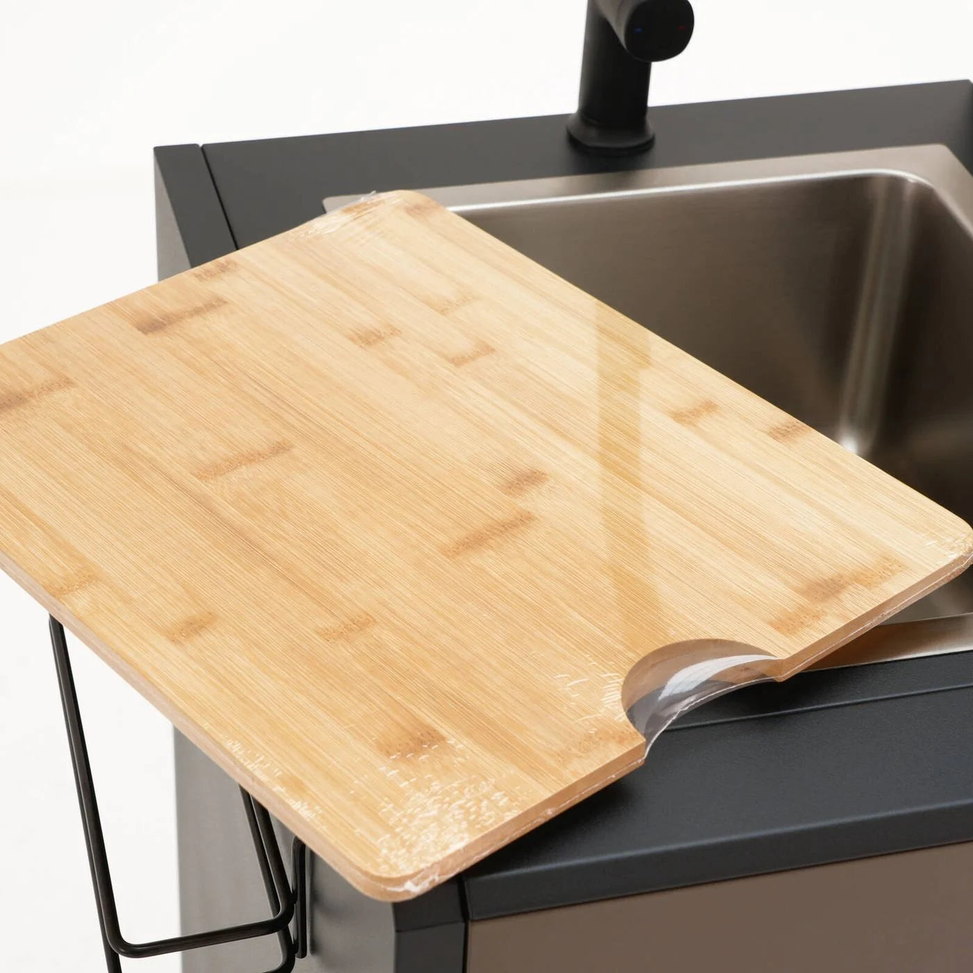 - Convenient chopping board and stainless-steel sink with mixer tap