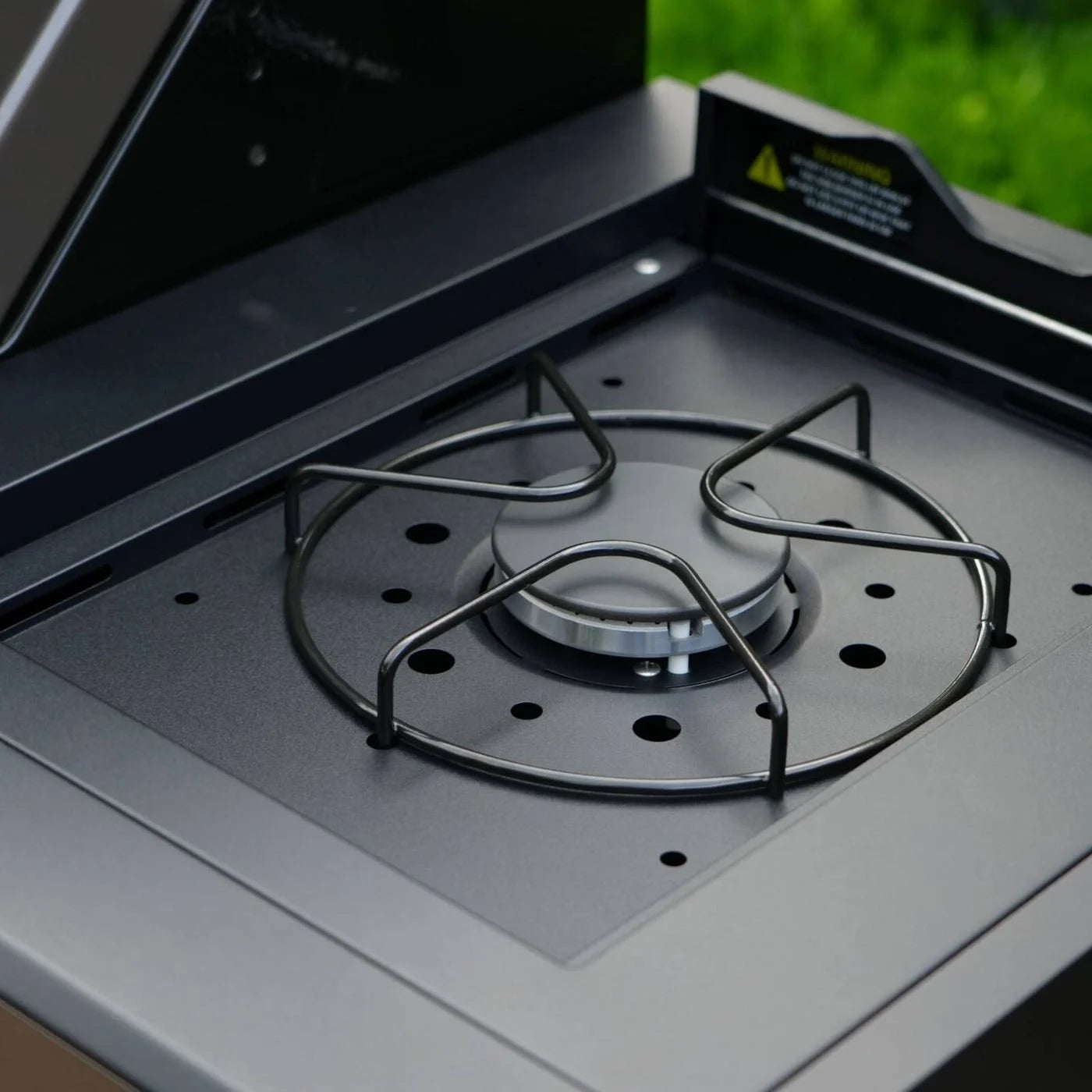 Perfect for the all-round entertainer, the Spark Outdoor Kitchen with 4 Burner BBQ is designed for those who want a complete and elevated grilling experience. Whether you're cooking for the family or hosting friends, the generous 3840 cm² cooking area (800L x 480W) and convenient side burner provide the space and flexibility you need. The Spark Kitchen offers ample storage with three deep drawers and a pull-out preparation table, while the integrated stainless steel sink, bamboo cutting board, and mixer tap make meal prep effortless. Its contemporary design is complemented by durable powder-coated construction, intuitive LED backlit controls, a paper towel holder, tool hooks, and a built-in bottle opener—ensuring you're ready for any occasion. Searing steaks or grilling vegetables is easy with the satin enamel cast iron cooking surface, which includes a versatile 50/50 split of grill grate and solid plate for optimal control and variety. Built for strength and convenience, it features heavy-duty metal castors for mobility, internal storage with double-skinned doors, and dedicated space for a gas bottle (sold separately). Supplied with an LPG LCC27 hose and regulator, the BBQ is also compatible with Natural Gas when fitted with an approved conversion kit (IN 0718026 Matador Natural Gas Conversion Kit sold separately) installed by a licensed gas fitter or plumber.