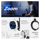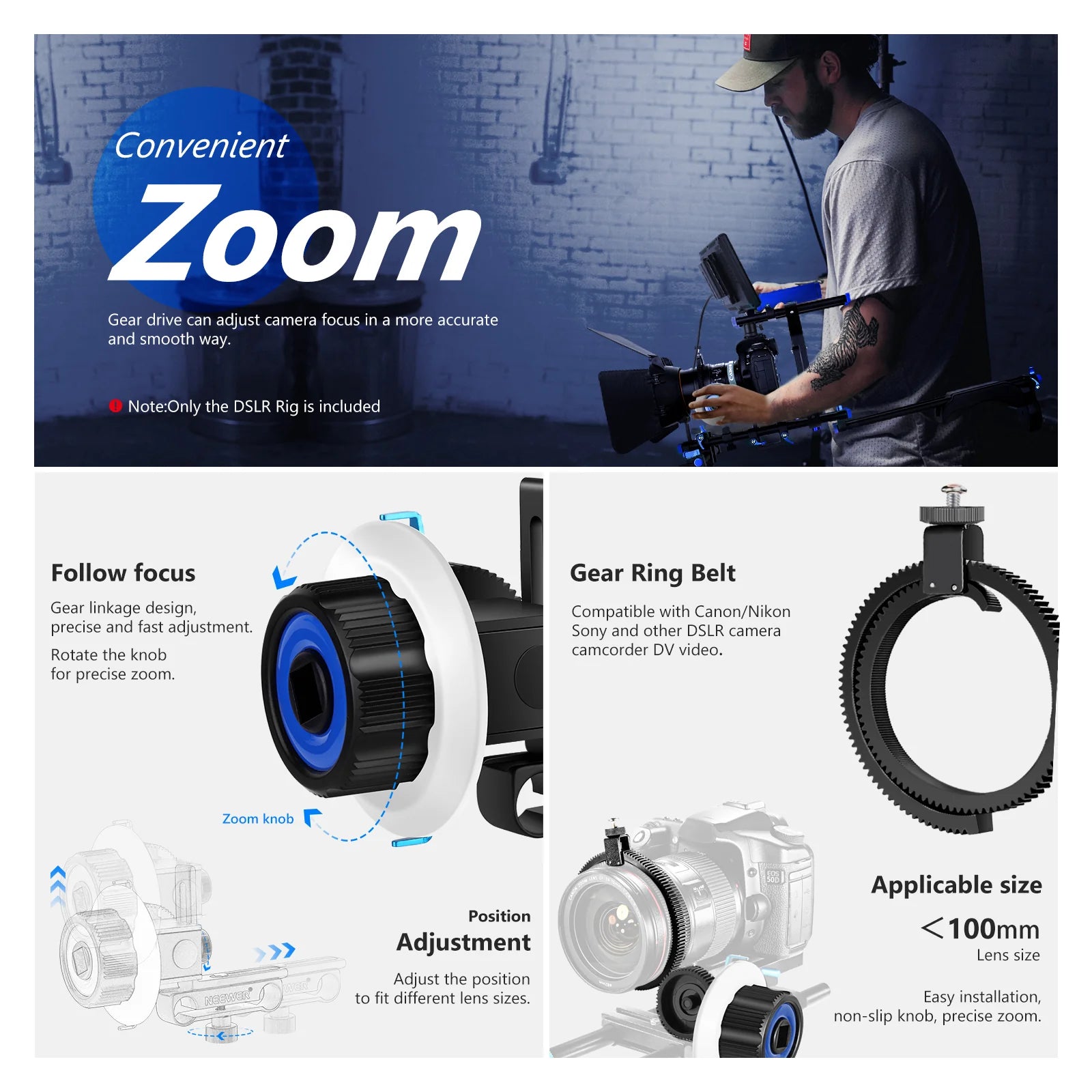 - Matte Box & Follow Focus- Matte box fits lenses 43–77mm in diameter. The three flags block excessive light and avoid lens glare for clear, sharp footage. Follow focus allows you to adjust the focus smoothly and accurately with one hand