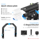- Accessorize the Setup- Multiple 1/4” and 3/8” female threads enable you to equip the rig with various devices, including microphones, monitors, flash strobes, LED video lights to facilitate your filmmaking
