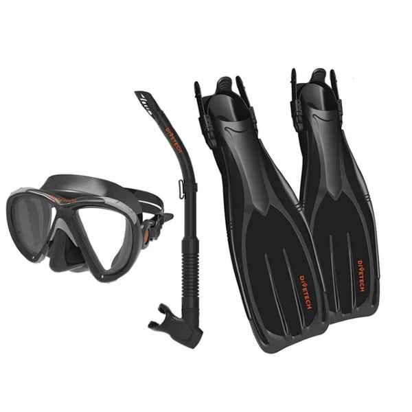 The set includes the Optrix Mask, Dropaway Purge Snorkel which offers easy clearing and a comfortable fit, and the Divetech Open Heel EDF Fin, which provides exceptional propulsion and control in the water.