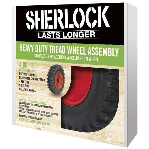 The Sherlock Standard Heavy Duty Tread Wheelbarrow Wheel is a complete and easy replacement wheelbarrow wheel. It is a standard 4.80-8 sized pneumatic wheel for comfortable use and ease of manoeuvrability. It is designed to suit all Sherlock wheelbarrow models. It features a steel rim with 1” sealed bearings.