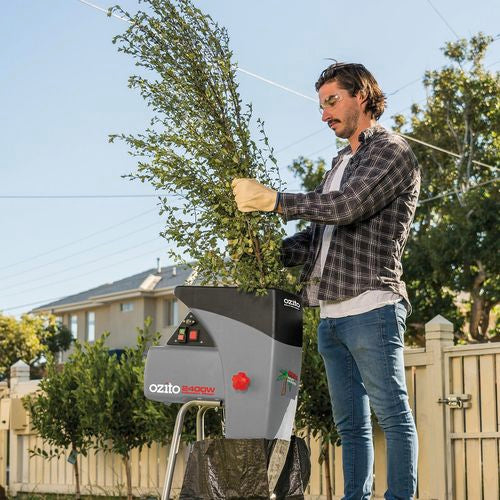 The Ozito SSH-2440 silent shredder is ideal for shredding garden material, including dry plant waste, twigs, sticks, and branches up to 40mm thick.