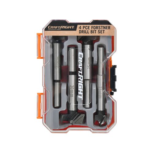 The Craftright 4 piece forstner drill bit set is ideal for drilling precise flat-bottomed holes in wood or chipboard. The handy set is packed in a lightweight carry case with transparent top for easy identification of content.