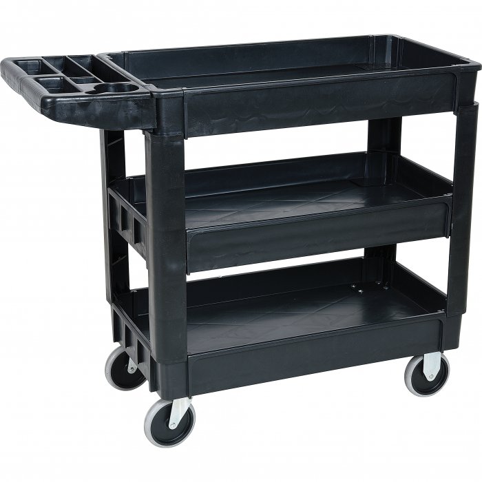 This movable service cart made from heavy duty plastic, 3 huge storage trays, includes an attached handle with spanner/tool holder, 250kg total load rating, ideal for the workshop or garage.