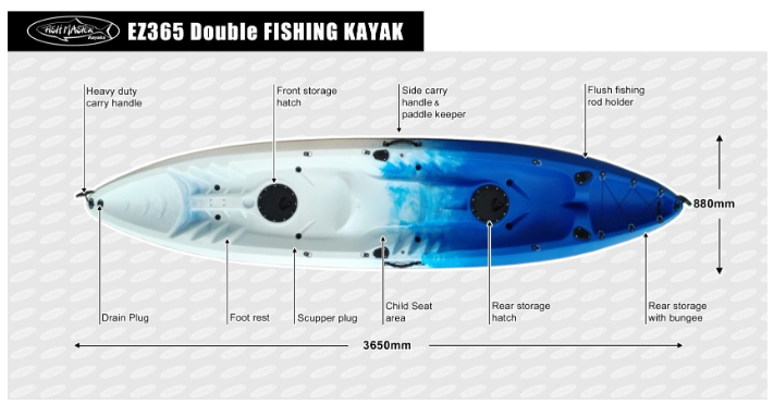 The EZ365 Double Sit On Top Fishing Kayak is designed for family fun and fishing adventures. Its 3.65m long and 88cm wide hull ensures stability, even in rough conditions. With ample space for two adults and a molded seat for a child, it's the perfect way to enjoy family time or go fishing together. Start your family's water adventure today!