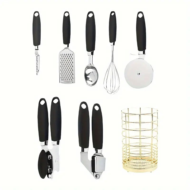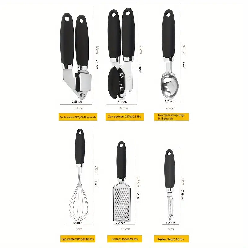 7-Piece Stainless Steel Kitchen Utensil Set - Manual Kitchen Gadgets with Comfort Grip Handles - Multifunctional Cooking Tools Including Whisk, Grater, Peeler, Ice Cream Scoop, Can Opener, Garlic Press, and Pizza Cutter