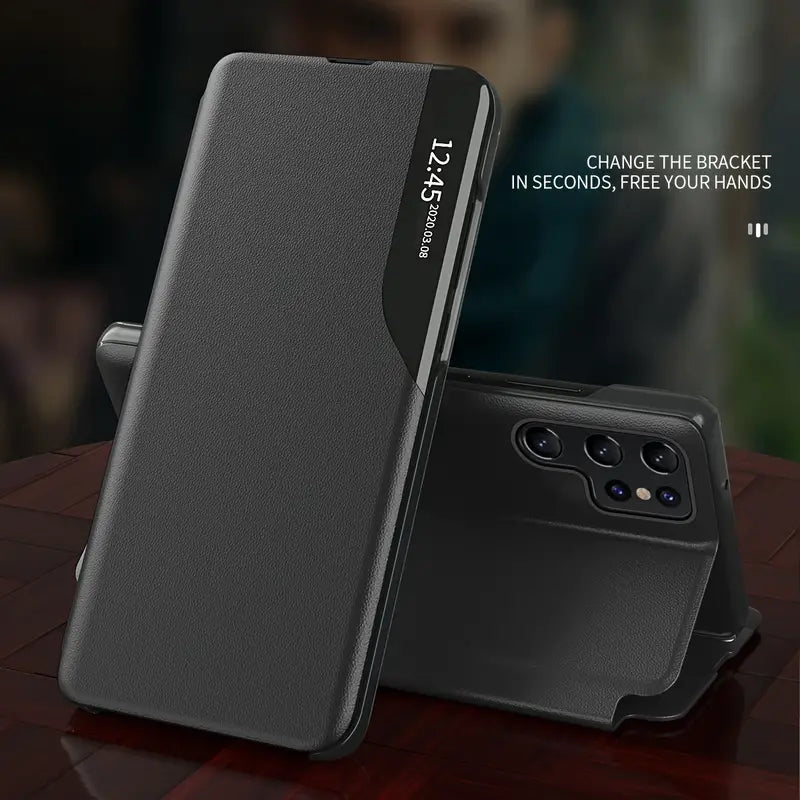 13C mobile phone case, all-round anti-fall flip cover stand, simple and high-end business half-side window leather case