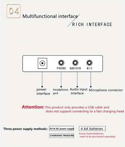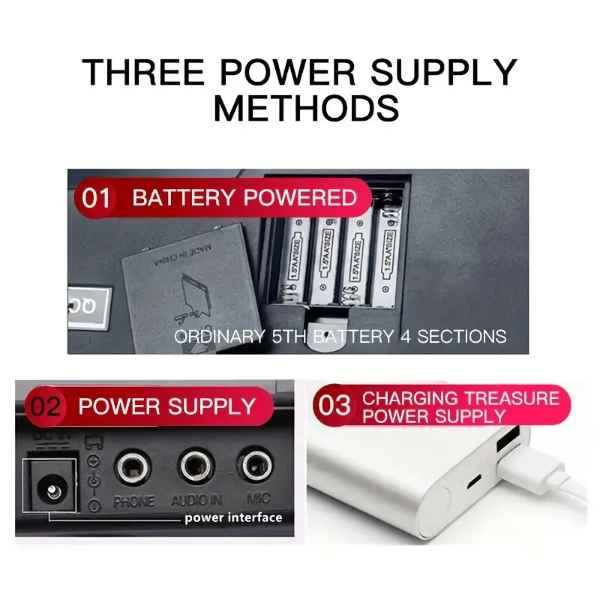 Power supply method: This piano can be connected to the 5V1A plug of your home phone using our configured USB cable. Please note that you cannot use a fast charging head, or you can use 4 AA batteries, or connect to your power bank (batteries and power banks are not included)Convenient to carry, play music anytime, anywhere.