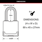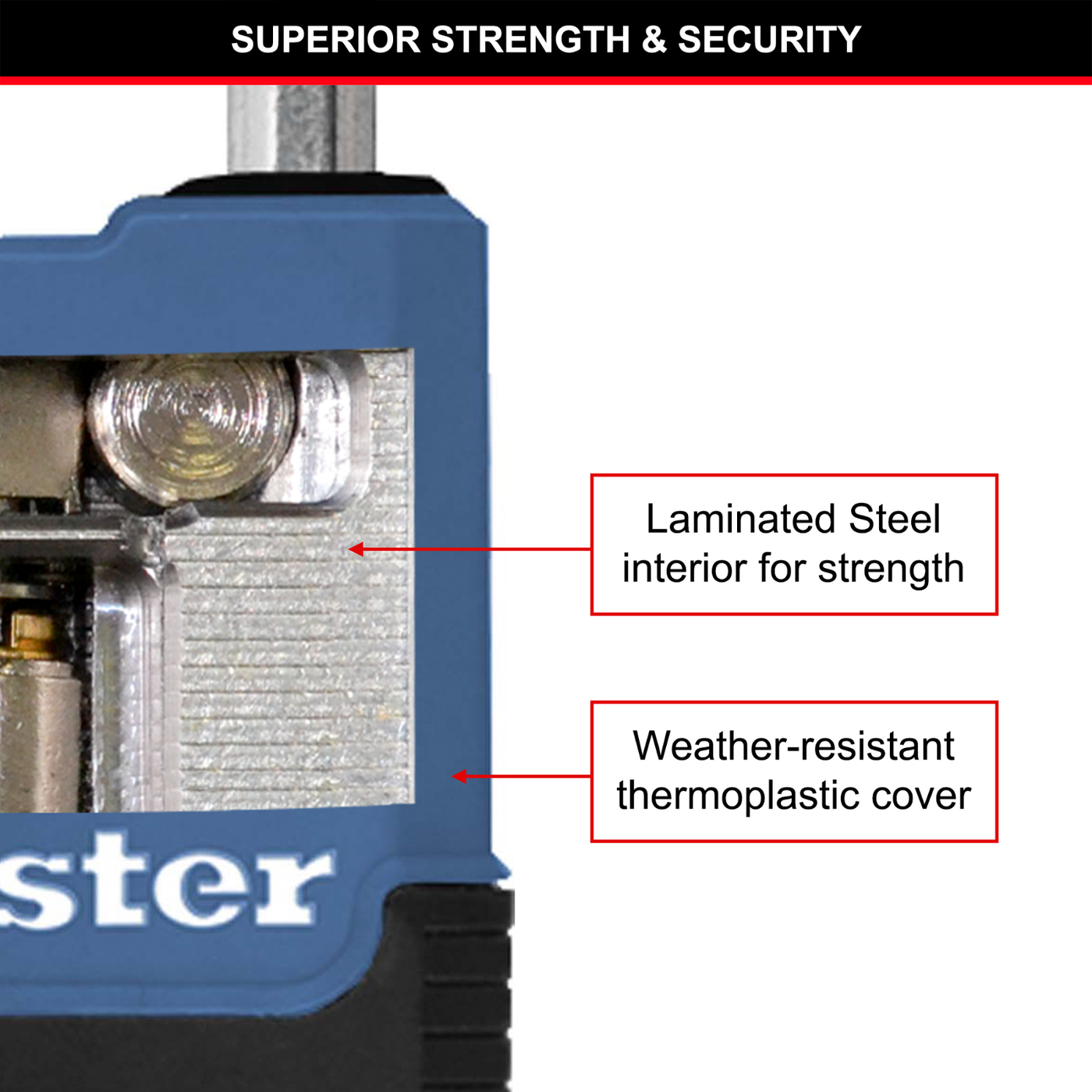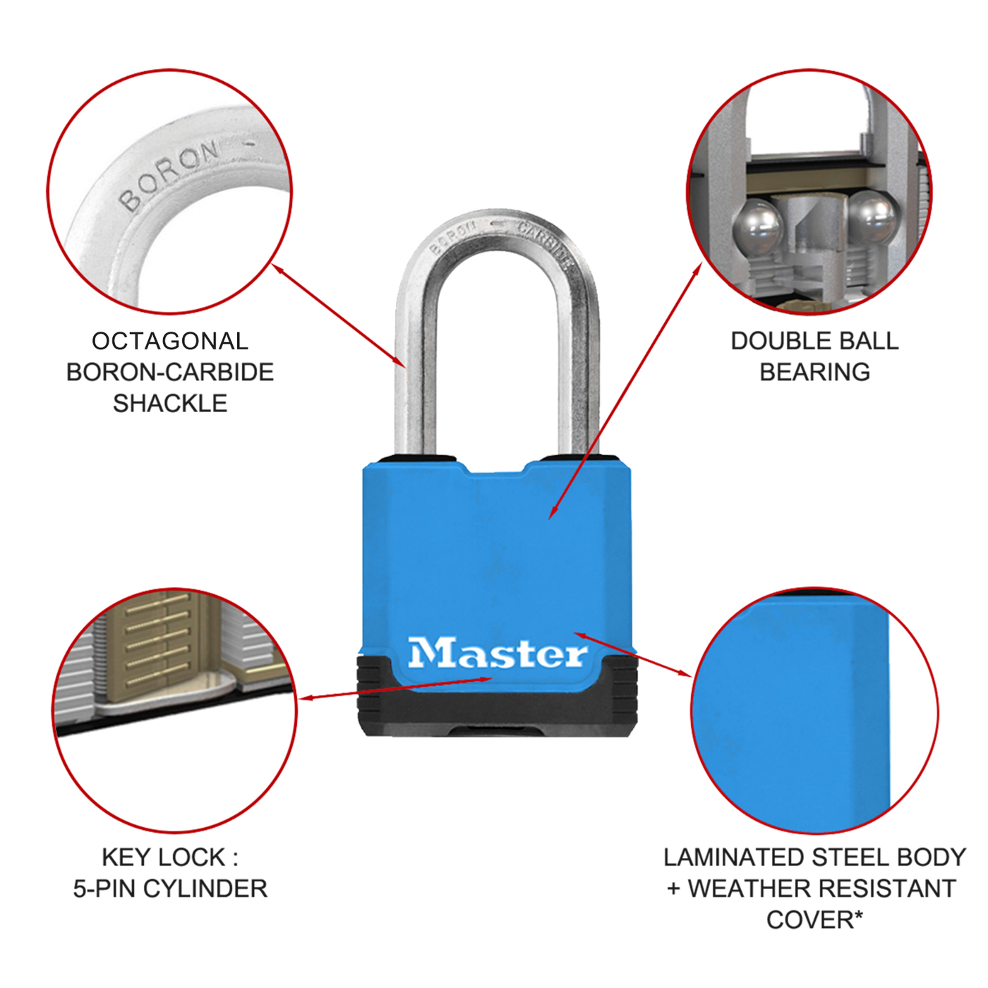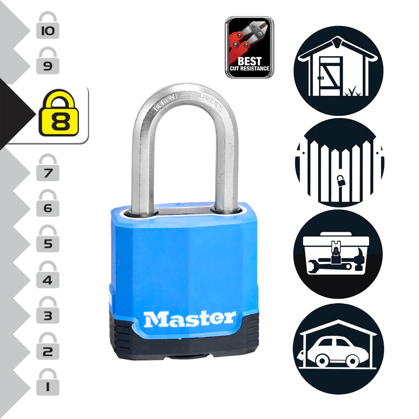 Master Lock use the toughest boron alloy material and cutting edge technology, registering over 40 patents, to create Excell: A truly high security padlock that is 50% stronger than a standard padlock. The laminated steel covered padlocks have a weather-resistant Thermoplastic cover, to protect the lock even in extremely bad weather conditions.
