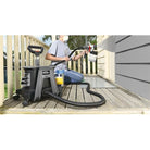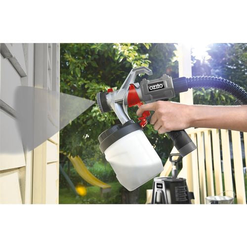 The mobile paint spray system with its telescopic handle, 3m air hose and transport wheels makes it easy to manoeuvre from one area to the next. Perfect for medium to large painting tasks such as wooden toys, household and garden furniture, walls, fences and much more.
