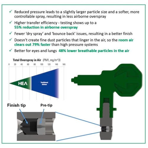 - HEA technology reduced pressure providing a softer and more controllable spray, resulting in up to 55% less overspray, providing efficient usage of paint with less paint wasted when spraying