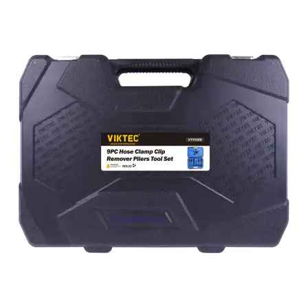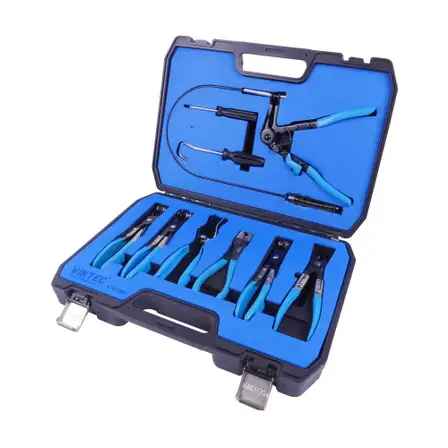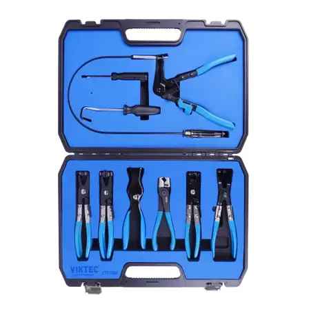 This Viktec kit not only contains a traditional hose clamp plier, but also; two swivel jaw hose clamp pliers; an angled flat bank hose clamp plier; a flat bank hose clamp plier; clic-r collar pliers; hose remover pliers; a screwdriver; and a hose remover.