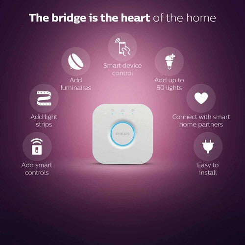 Get started with Philips Hue and control your lights from your smart phone or tablet, or even with your voice. The Philips Hue bridge is the heart of the system. It unlocks endless possibilities through the Philips Hue app.