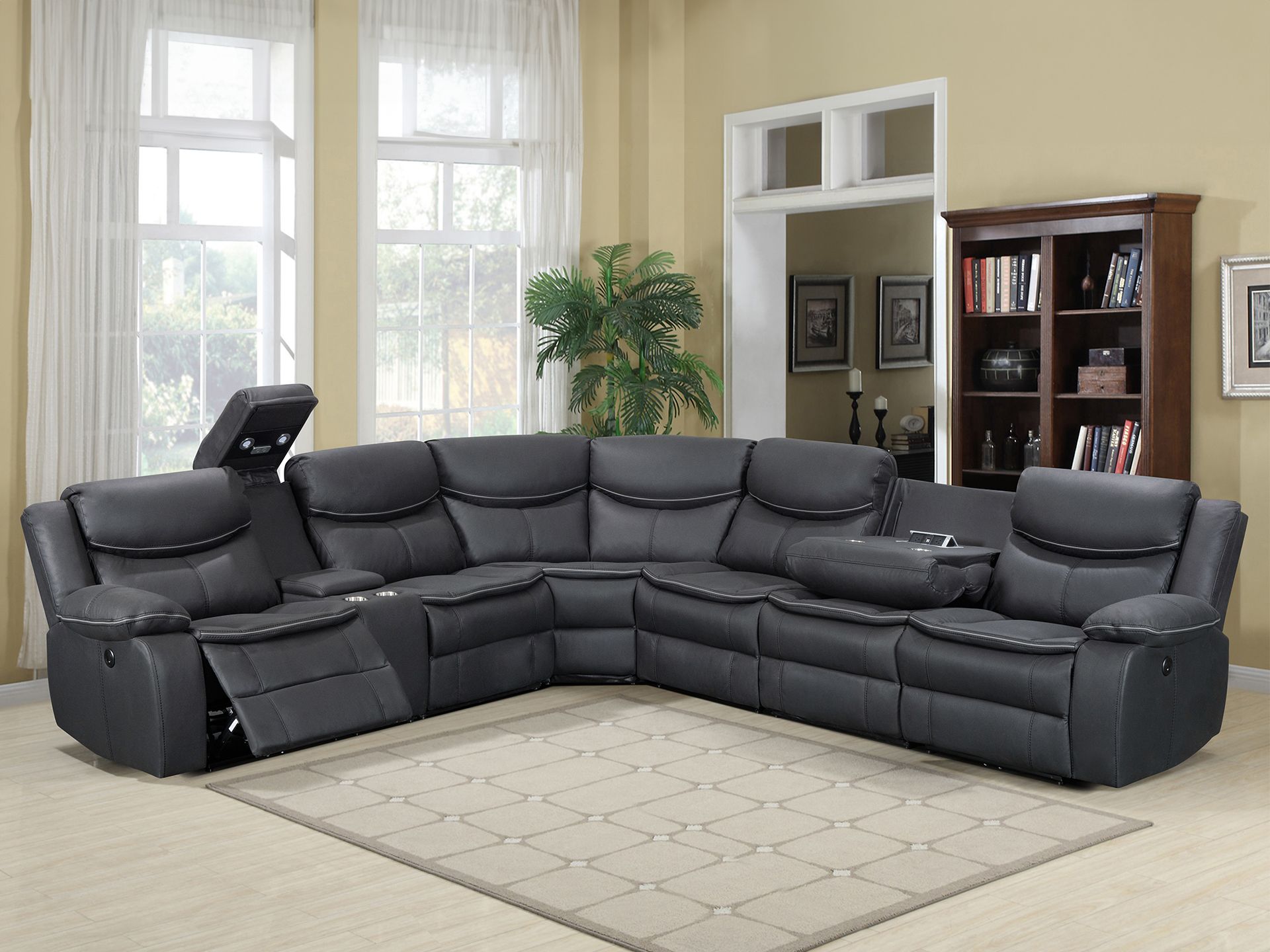 Immerse yourself in the luxury of our multi-functional sofa, equipped with power motion recliners on left and right, a console, armless recliner, armless chair with drop down table, normal armless chair and a chic wedge!