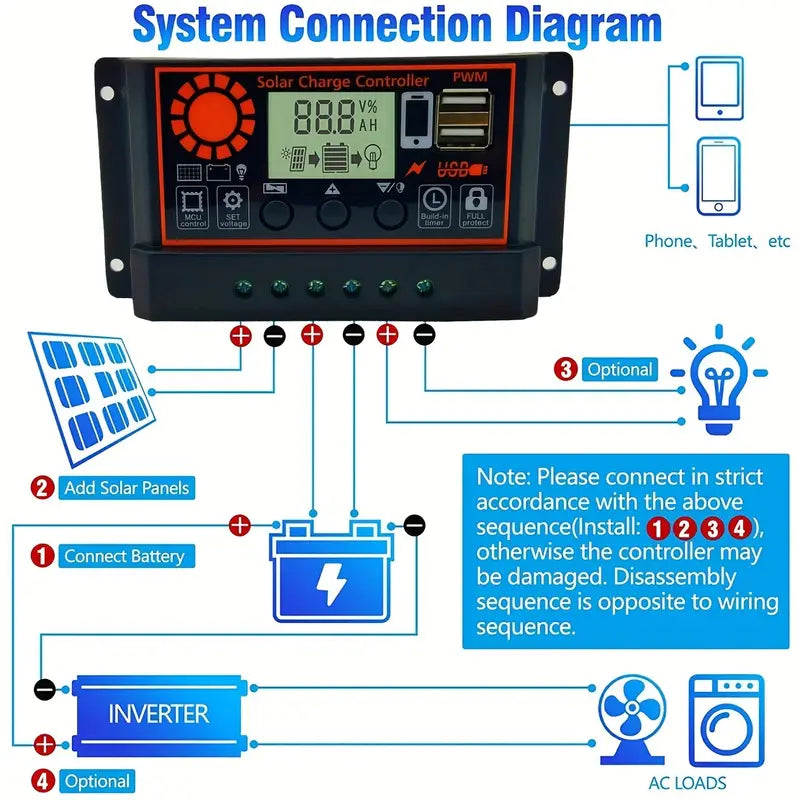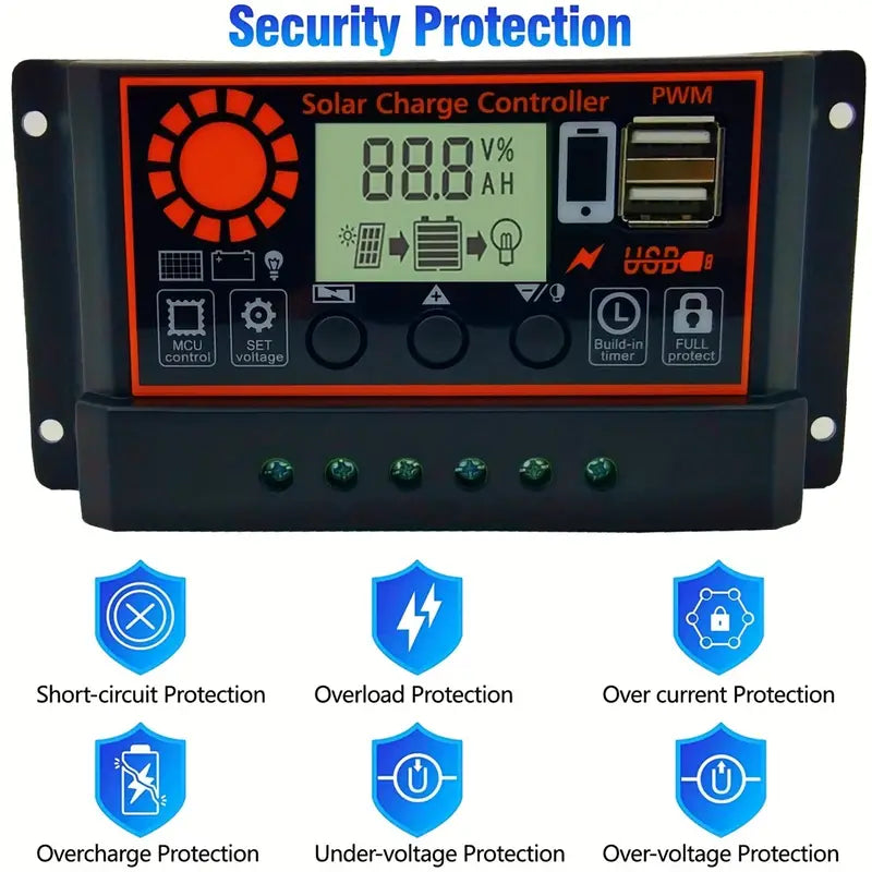 Safe and Reliable: The controller is designed with multiple safety features to protect your battery and devices from overcharging, short-circuiting, and reverse polarity.