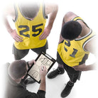 One side featuring a full court for diagramming plays, while the other allows coaches to set and adjust lineups using the 12 white and 12 yellow rectangular magnets.