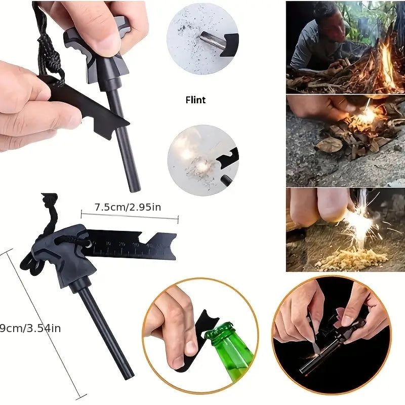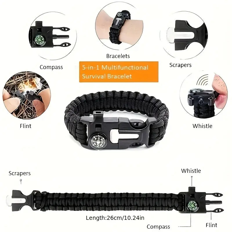 Essential survival gear: Includes a variety of tools for emergency situations such as a compass, fire starter, whistle, and more