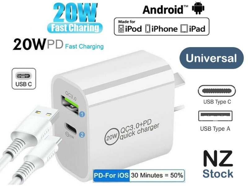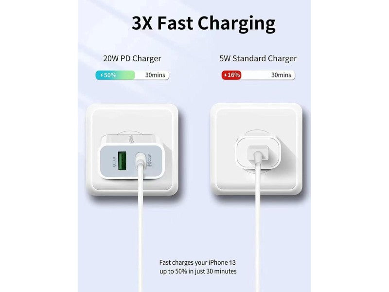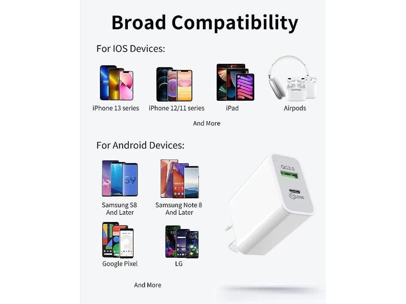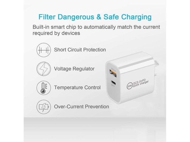 * 2 in 1 Charging Block: With a USB-C port that supports PD 20W fast charge and a USB-A port that supports QC3.0 18W fast charge.