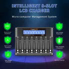 8 independent charging designs allow you to charge any number of 1-8 AA and AAA batteries (excluding battery sales).
