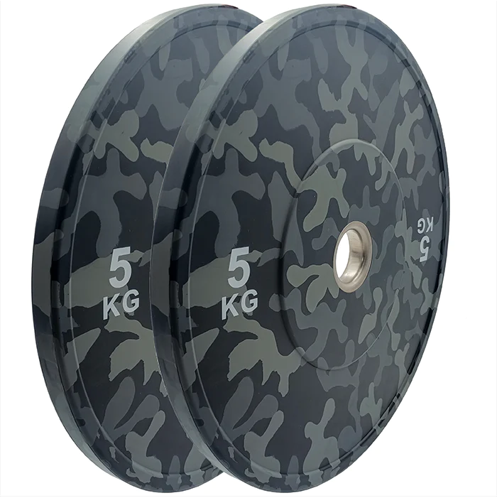 Heavy duty camo rubber Olympic bumper plates are hardened to withstand whatever you throw at it, the steel ring protects against damage to the rubber. Designed with low bounce these plates are suited to any workout from below waist to overhead. IWF Standard 450mm diameter and 50.5 fits your barbell perfectly and the solid rubber means no noisy clanking or harsh drop sounds when they hit the floor.