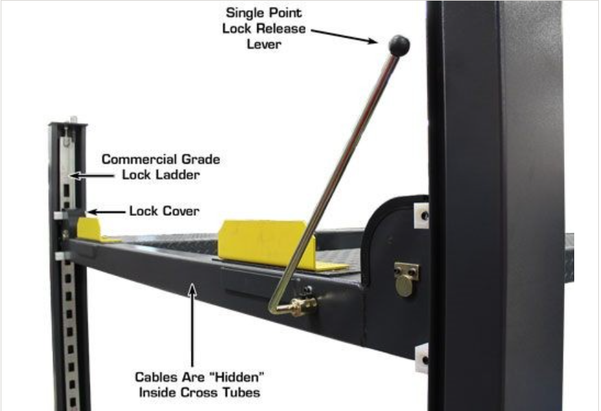 Double-"S" shape columns to increase the columns strength Commercial double safety lock system Skid proof diamond platform Supplied with: Plastic drip trays(4 pcs),Jack tray (1 pc), steel wheel stops, oil & bolts Power side column can be installed on any corner 240V single phase power unit.