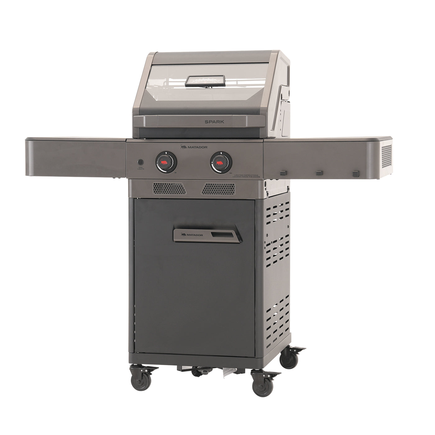 Compact yet powerful, the Spark 2 Burner BBQ is crafted for those seeking the ultimate grilling experience. Whether it's for those cooking for smaller groups or having smaller spaces, with 2300 cm2 (400w x 480D) of cooking space and folding side shelves this is a great BBQ choice. With its contemporary design, durable powder coated construction, intuitive LED backlit controls, paper towel holder, tool hooks and bottle opener you will be getting results every time. Whether you're searing steaks or grilling veggies, the Spark’s satin enamel cast iron cooking surface delivers precise cooking control. The BBQ comes with a versatile 50/50 Cooking Grate and Solid Plate configuration. The Spark comes with cast aluminium handle mounting details to deliver a strong hood handle construction and feel when in use. Robust trolley design includes strong metal castors, gas bottle storage (gas cylinder sold separately) and a double skinned door.