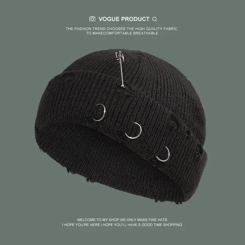 Mens New Personalized Iron Ring Pin Hole Knitted Wool Cap BLACK