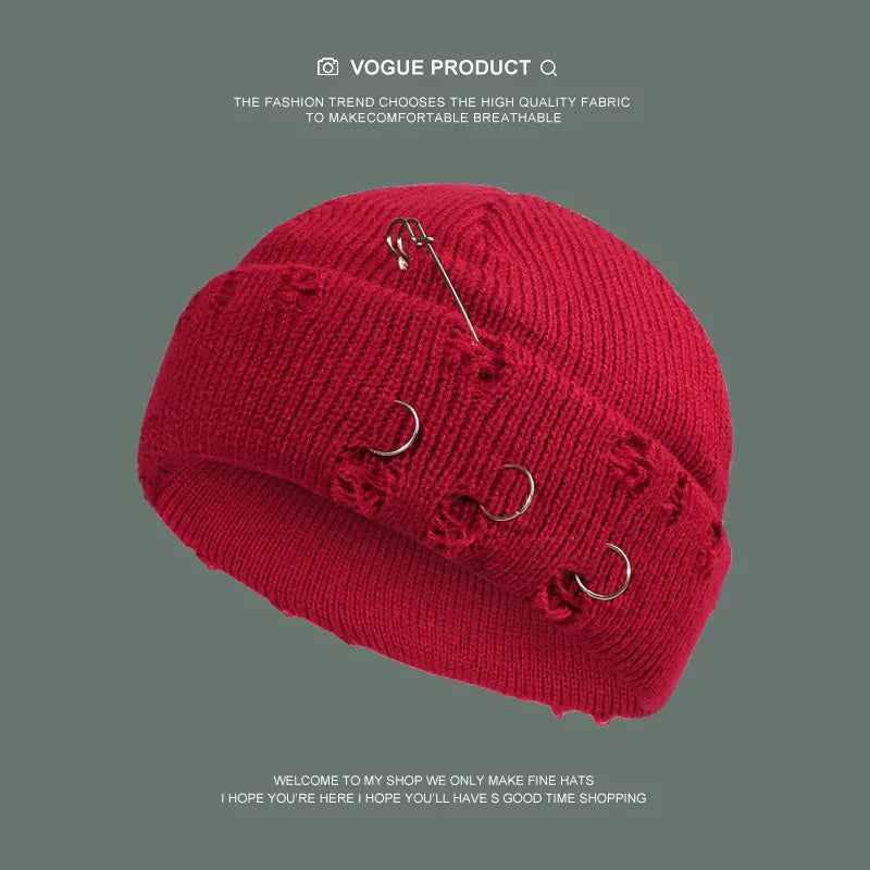 New Personalized Iron Ring Pin Hole Knitted Wool Cap RED