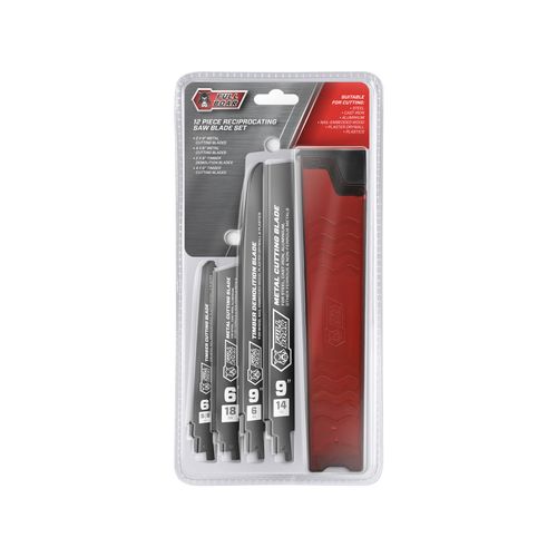 This 12 Piece Reciprocating Saw Blade Set will tackle a range of cutting jobs on a worksite. The metal cutting blades are suitable for steel, cast iron, aluminium and other ferrous and non-ferrous metals while the timber cutting and demolition blades will power through wood, nail-embedded wood, plaster drywall and plastics.