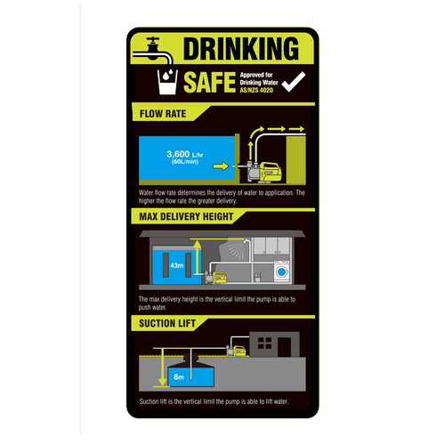The RYOBI 900W Drinking Safe Constant Pressure Water Pump provides a consistent flow of water to your shower, tap, toilet, or laundry. Its internal pressure switch measures the current water flow and kicks the pump into gear whenever the pressure drops.