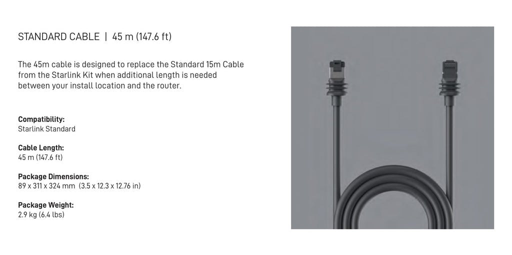 The 45 m (147.6 ft) Starlink Cable is designed to replace the cable between the "Standard Starlink Dish and the Power Supply when additional length is needed.